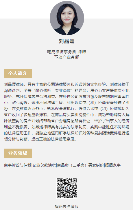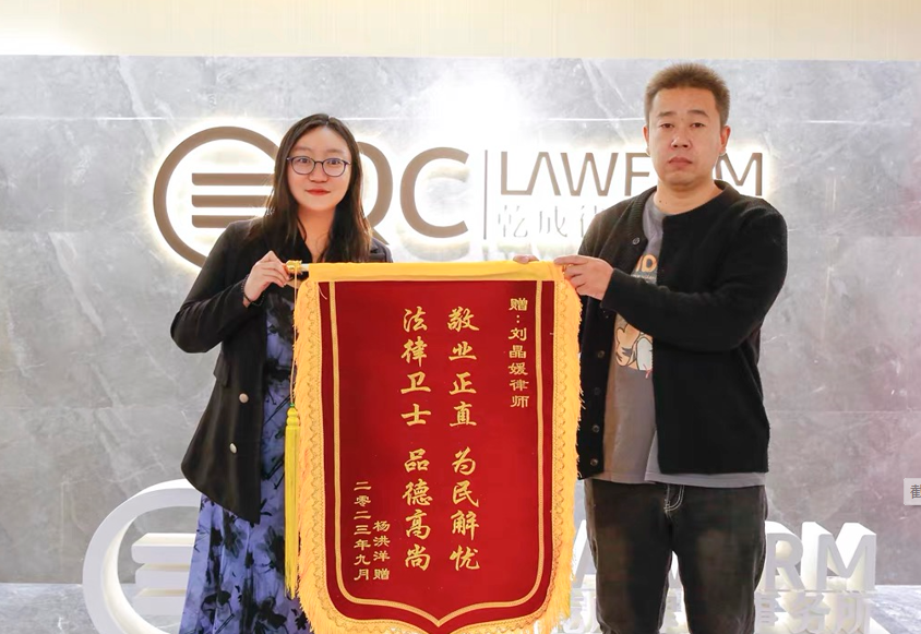 2023年9月25日,某房屋買(mai) 賣合同糾紛案當事人親(qin) 自來到乾成律所總部,向該案承辦律師—我所不動產(chan) 業(ye) 務部劉晶媛律師親(qin) 手贈送了一麵錦旗,上書(shu) “ 敬業(ye) 正直 為(wei) 民解憂 法律衛士 品德高尚”十六個(ge) 大字。這一評語充分表達了當事人對乾成律師的信任與(yu) 感謝,體(ti) 現了乾成不動產(chan) 業(ye) 務團隊精深的專(zhuan) 業(ye) 素養(yang) 和高度的敬業(ye) 精神。